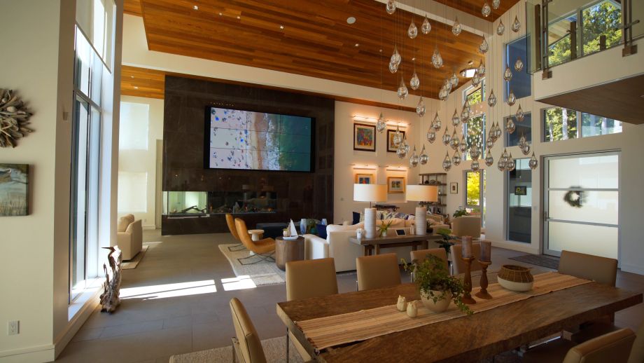 This home has large, angled windows that follow the unique roofline to showcase the waterfront views. These can be challenging for window treatments, but Wipliance's team installed custom Lutron roller shades that raise from below with a tensioned system to protect furnishings and shield the home from UV glare. In bedrooms, Wipliance installed Lutron's Palladiom Wirefree shading system for a clean and modern aesthetic.