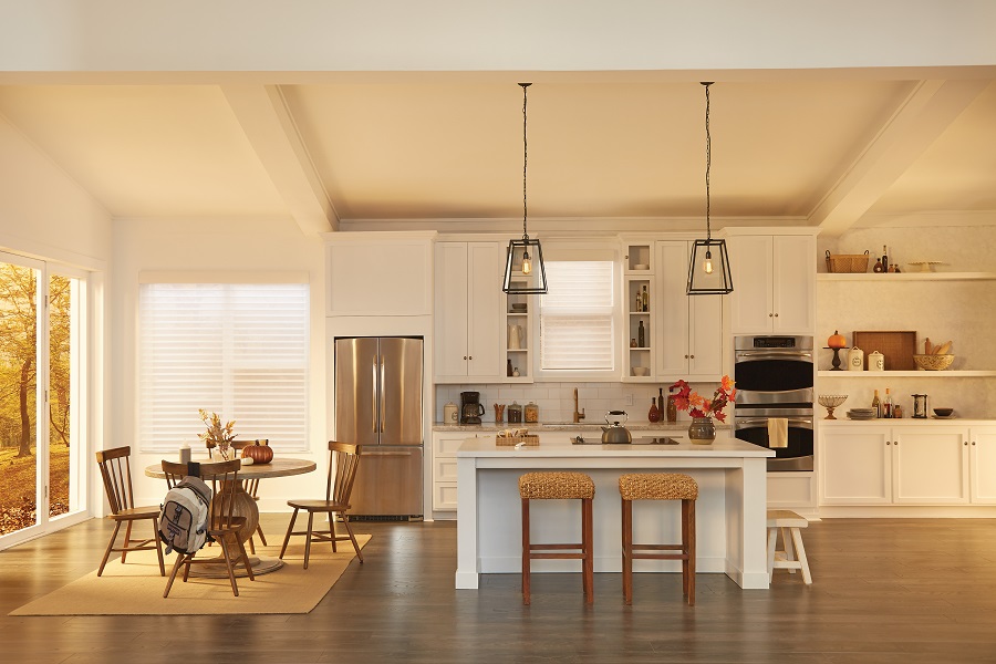 Keep warm air indoors by pairing your thermostats with motorized honeycomb shades by Lutron. Insulating honeycomb shades are designed to prevent heat from escaping so you can stay comfortable longer while boosting energy efficiency. Open them with a button tap on sunny days to let solar heat warm your home and automate them to lower on their own when a room starts to get cool.