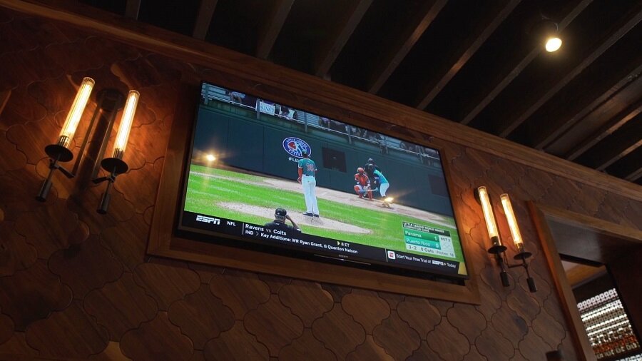 To maintain a cohesive design throughout the eatery, Wipliance created custom wood TV treatments for all Sony TVs so that their displays look like flush picture frames on the walls. Rather than clashing the ambiance, their TVs blend with their décor, and all components and wiring are neatly hidden from sight.
