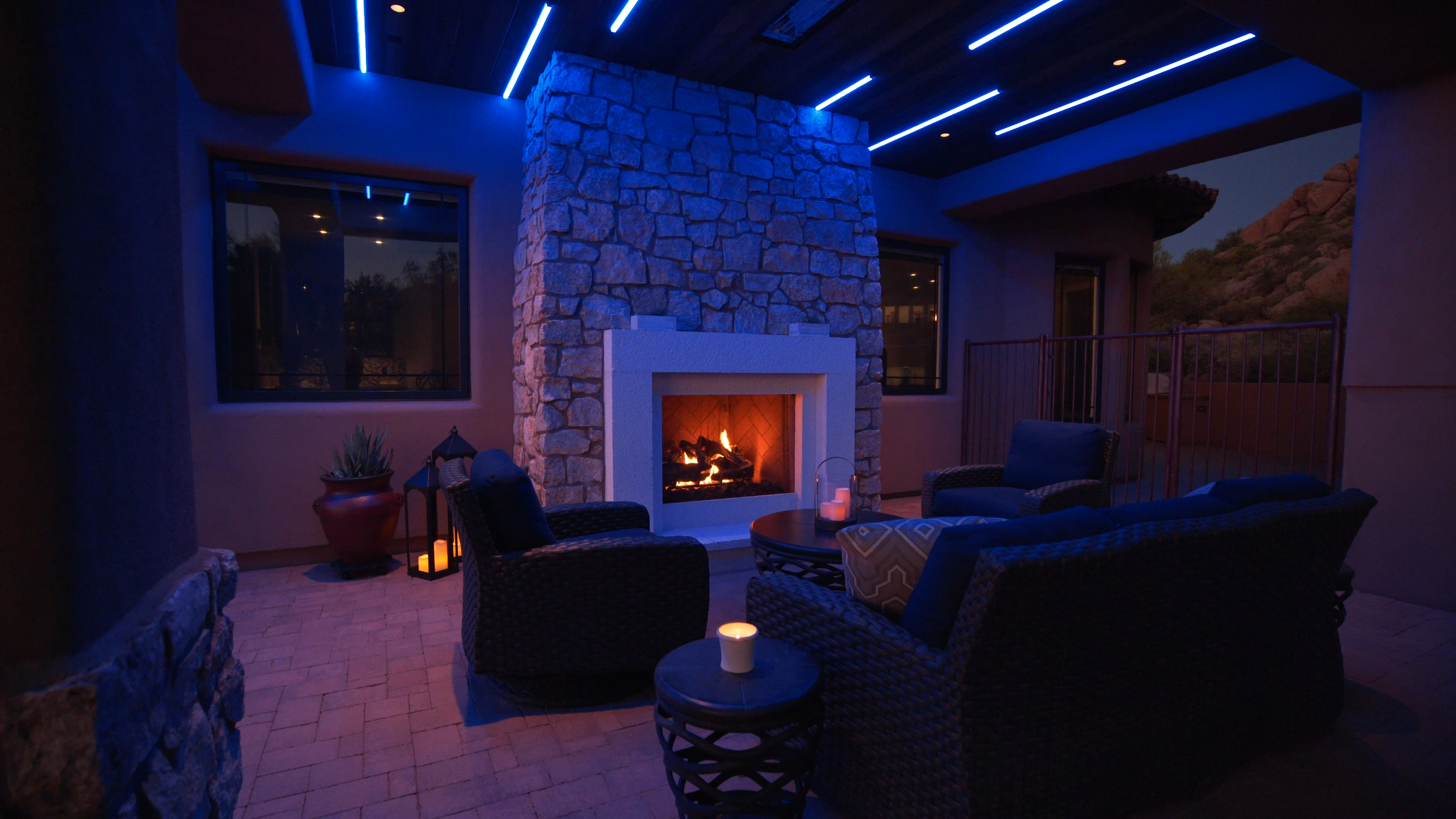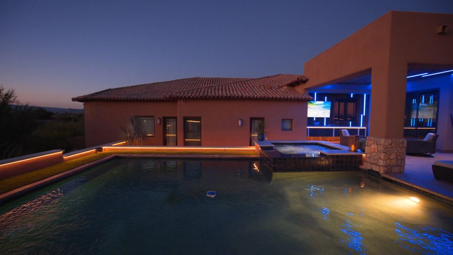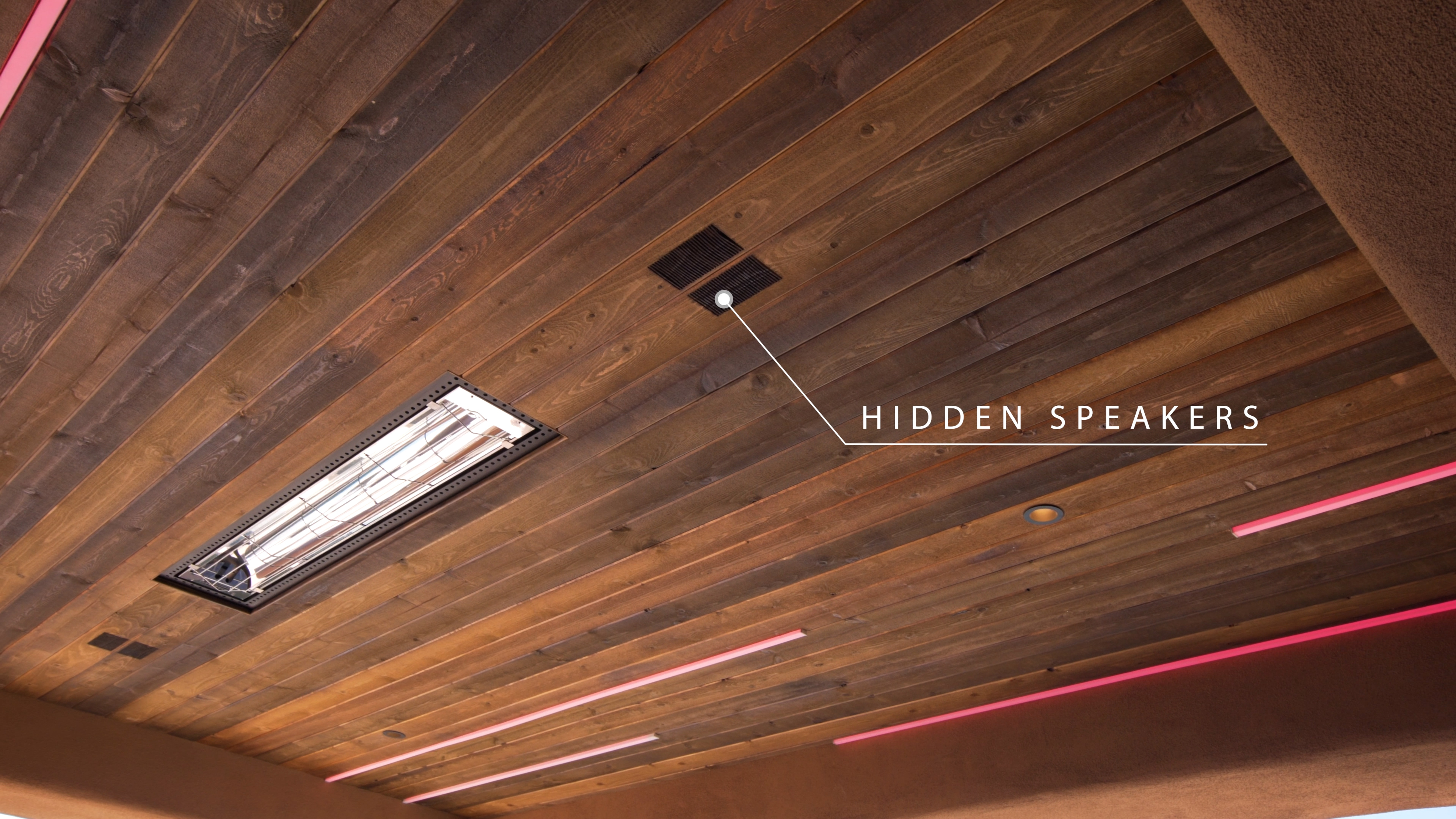 Maude Haus Interiors and Signature Custom Homes partnered with Wipliance to create this impactful installation of linear and recessed lighting that is directly integrated into the tongue and groove wood accents. Outdoor patio heaters and concealed small aperture speakers bring full functionality of light, heat and sound without distracting from the design. Rich wood tones are complimented by the bright limestone caps to balance the classic Arizona architecture.