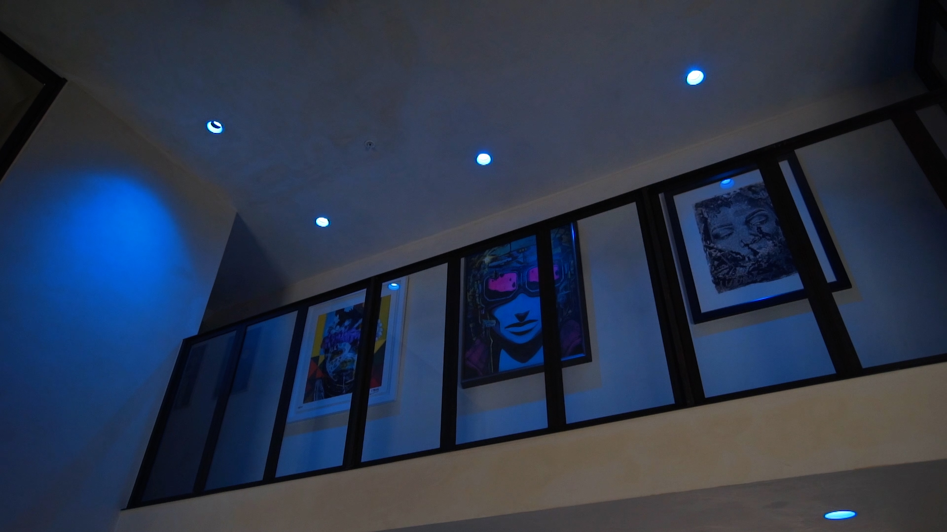 The client wanted a clean and modern design where fixtures had minimal openings but delivered ample light to match the daylight temperatures, delivering bright whites at the height of the day and warmer tones in the evening. This client is an art collector, so having museum-quality whites as well as the ability to remix the color of light on his art was a goal. Having individual addressability of zones for flexibility, but convenient scenes that would dial in the whole space based on a task or time of day. High fidelity audio and video as well as a smooth interface to manage all technology was a focus.