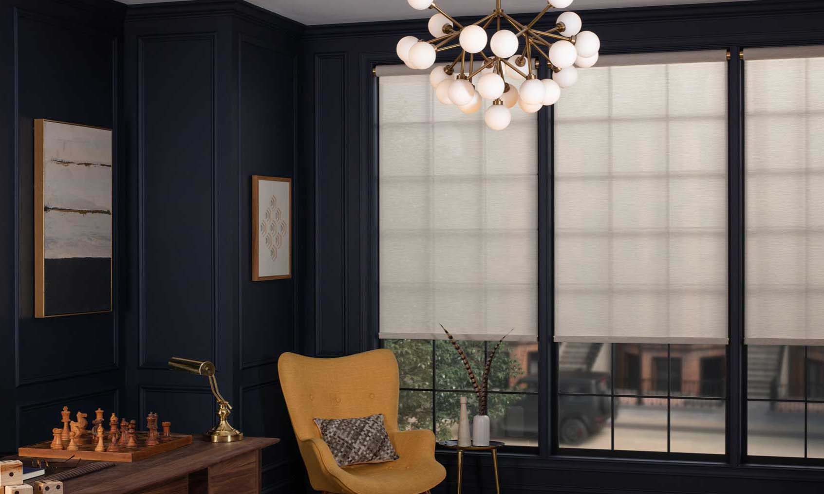 Palladiom shades are available in multiple finishes, including aged bronze, satin nickel, and silver, and can cover large windows, up to 12 feet by 12 feet.
