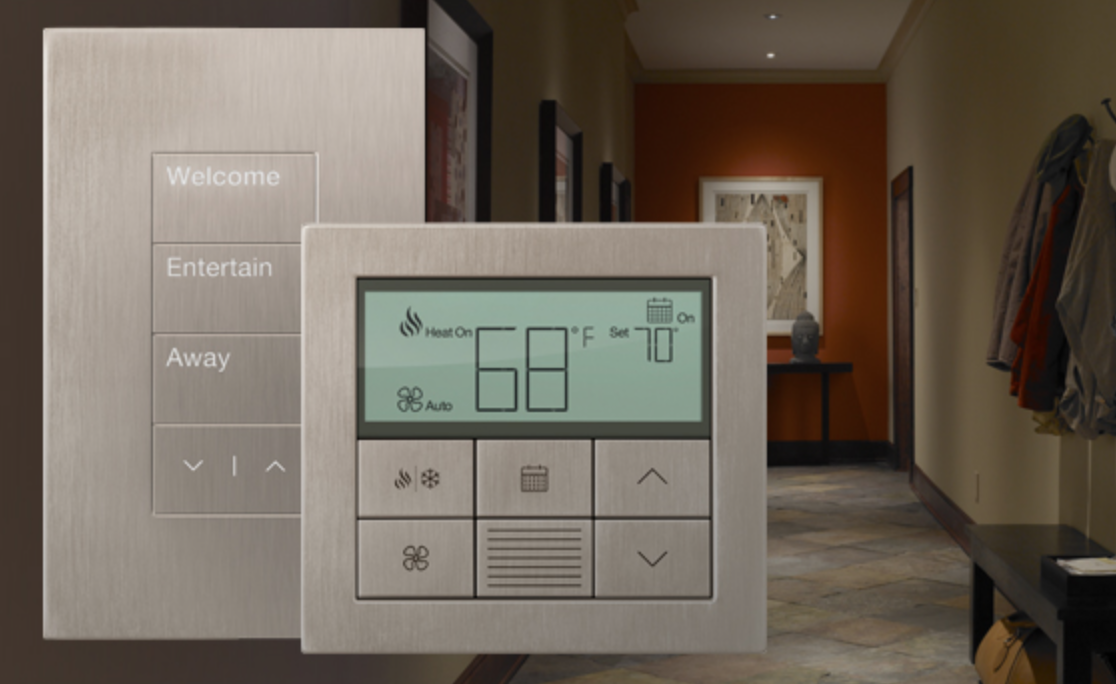 Lutron offers coordinating thermostats and lighting control keypads to complement your design, ensuring an integrated, elegant system for your home. Lutron Palladiom Shades seamlessly integrate with HomeWorks for unified smart home control, while Palladiom keypads offer elegant, intuitive operation of your lighting, shades, and other connected systems, all from a single, stylish interface.